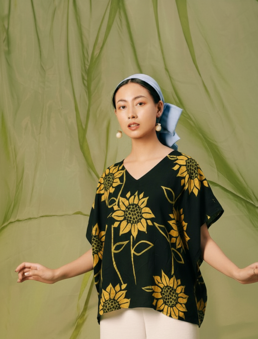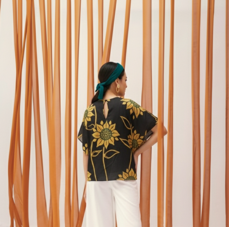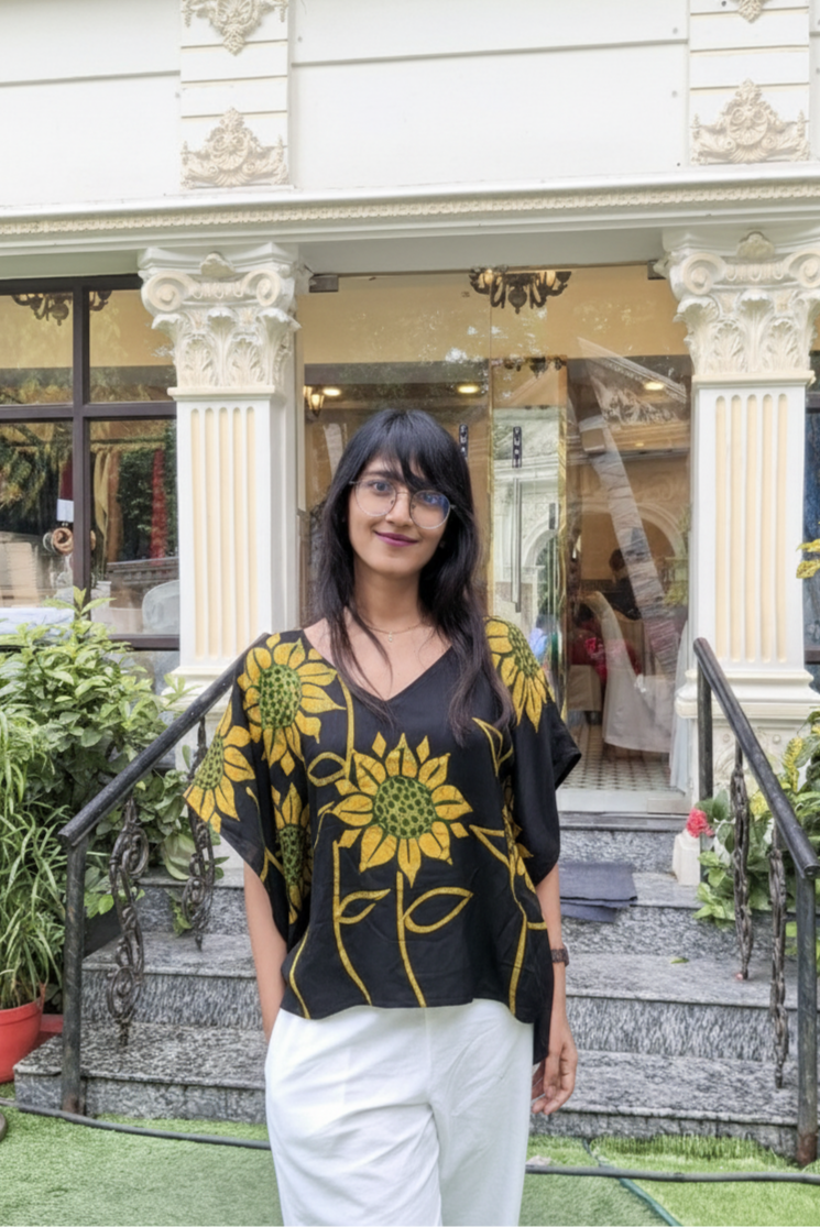 Black Sunflower Batik in Pure Cotton Crop Kaftan Top