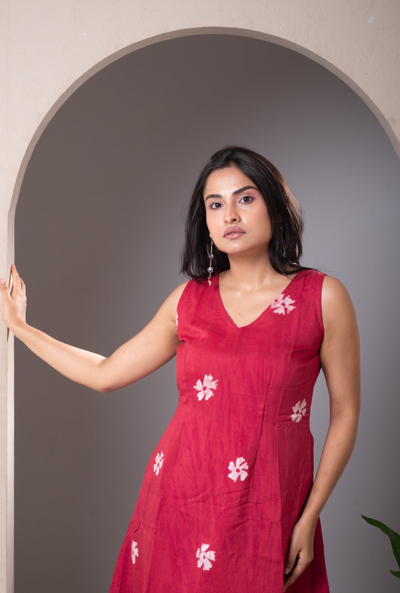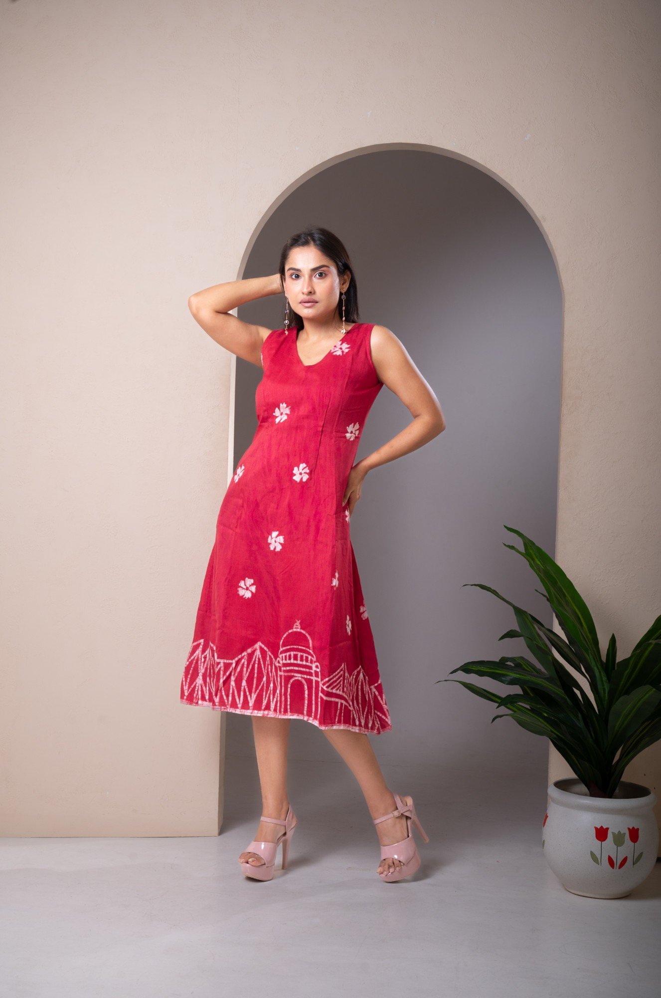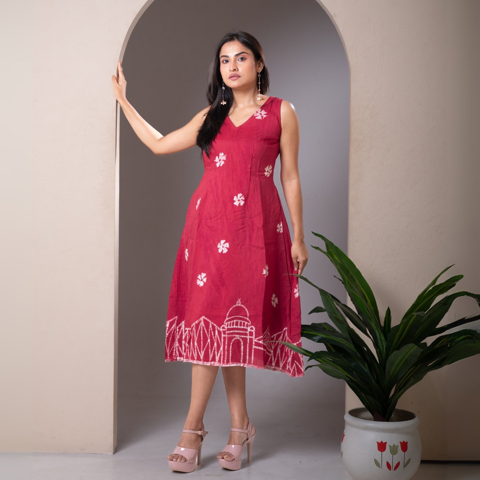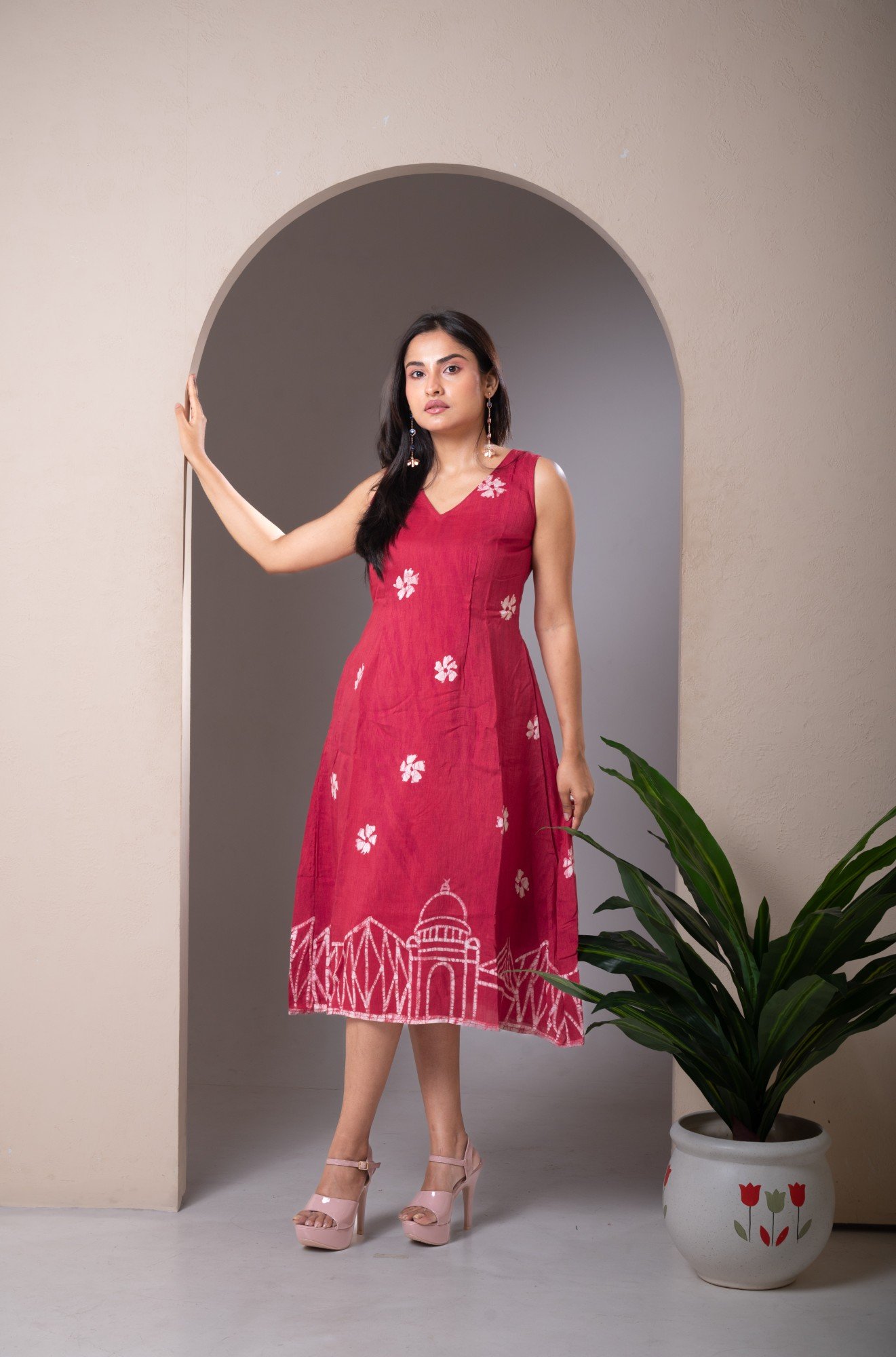 Kolkata Hand Batik Magenta Silk Belt Dress