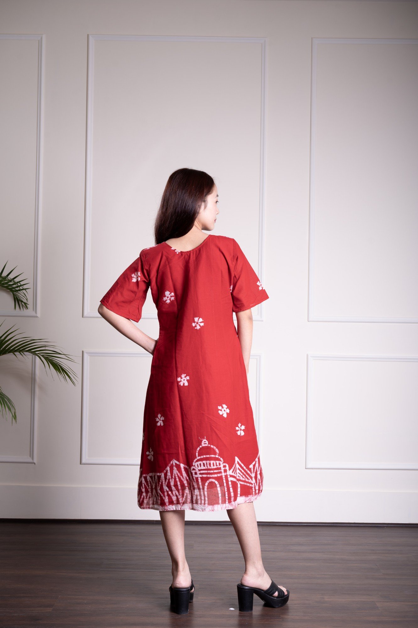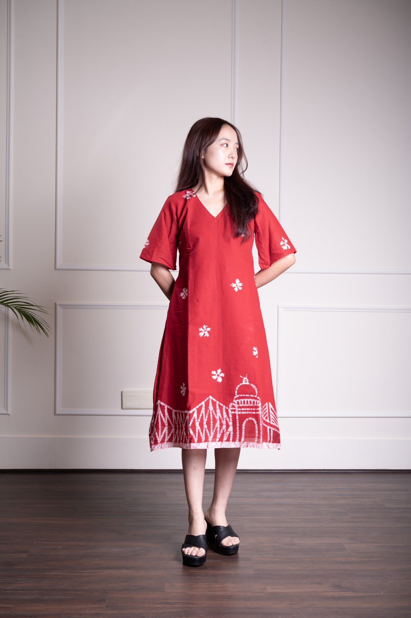 Kolkata Red Hand Batik Pure Cotton Dress With Sleeves