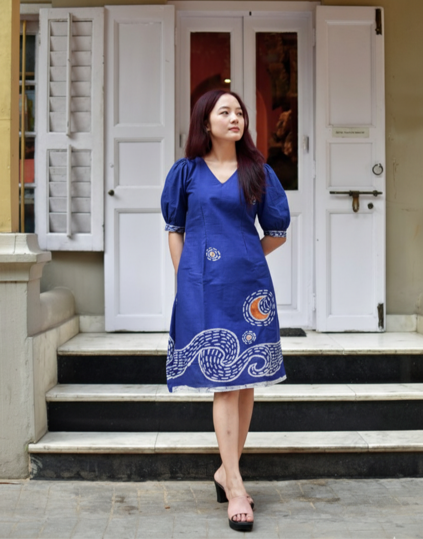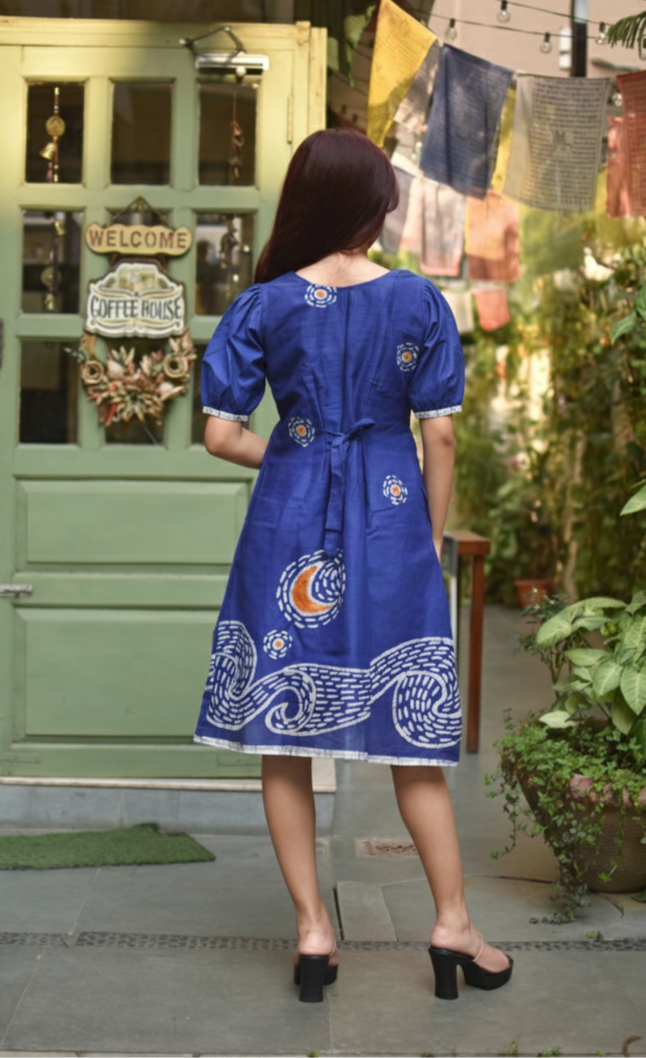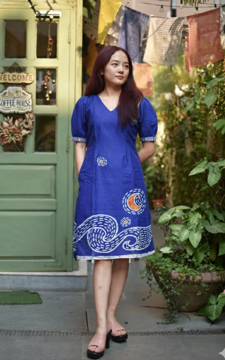 Starry Night Batik Art Pure Cotton Blue Sleeves Dress