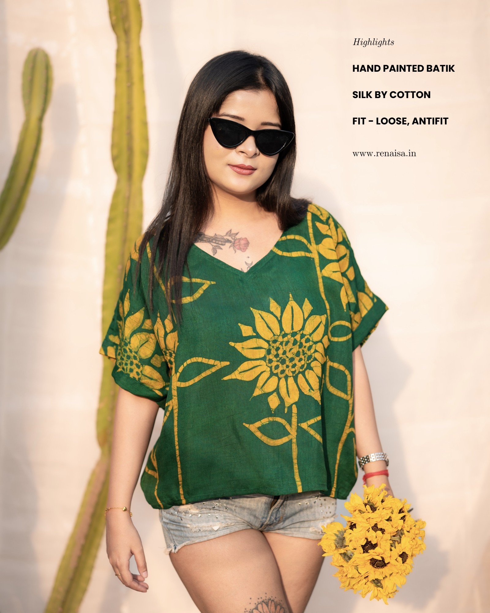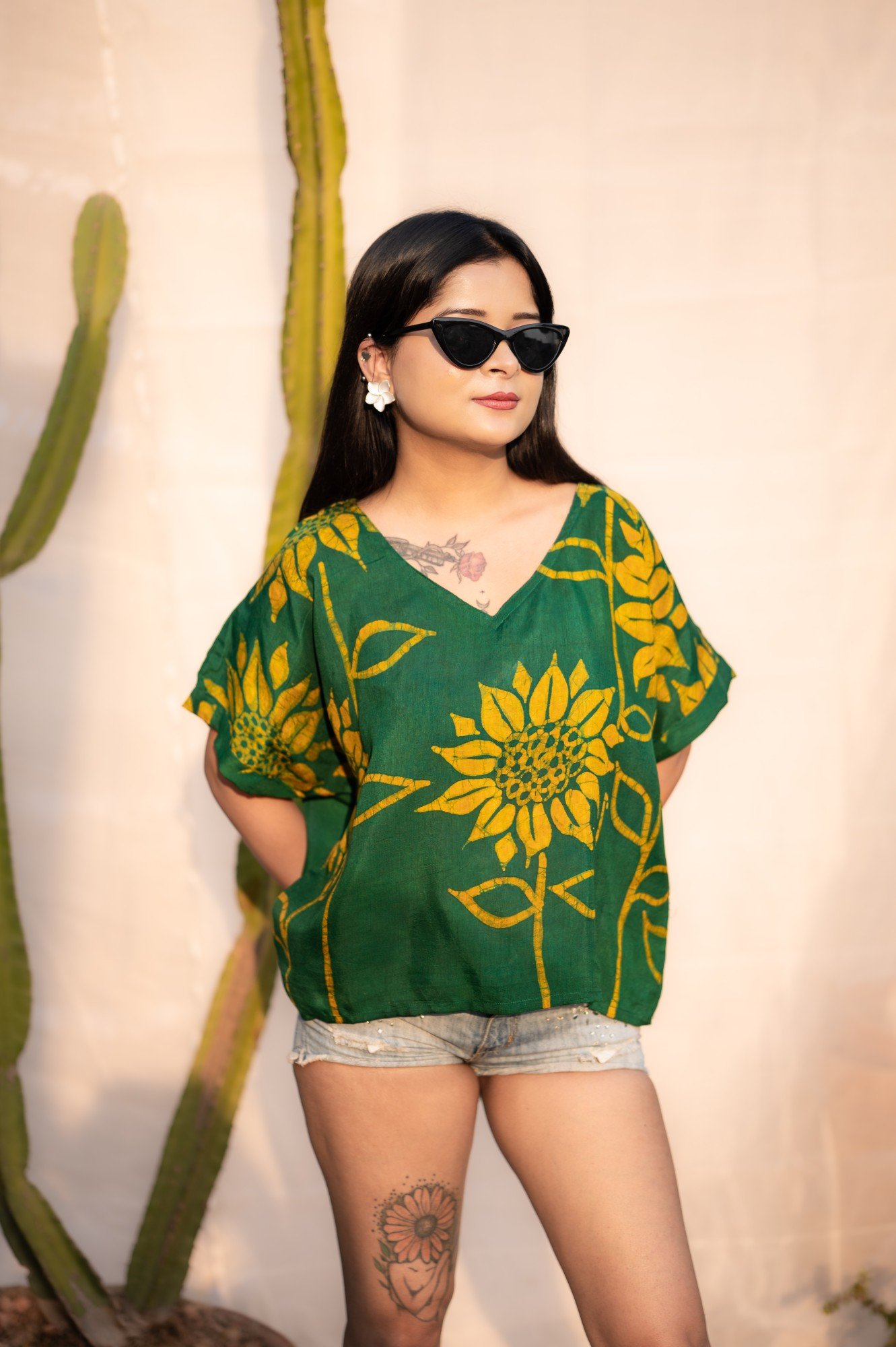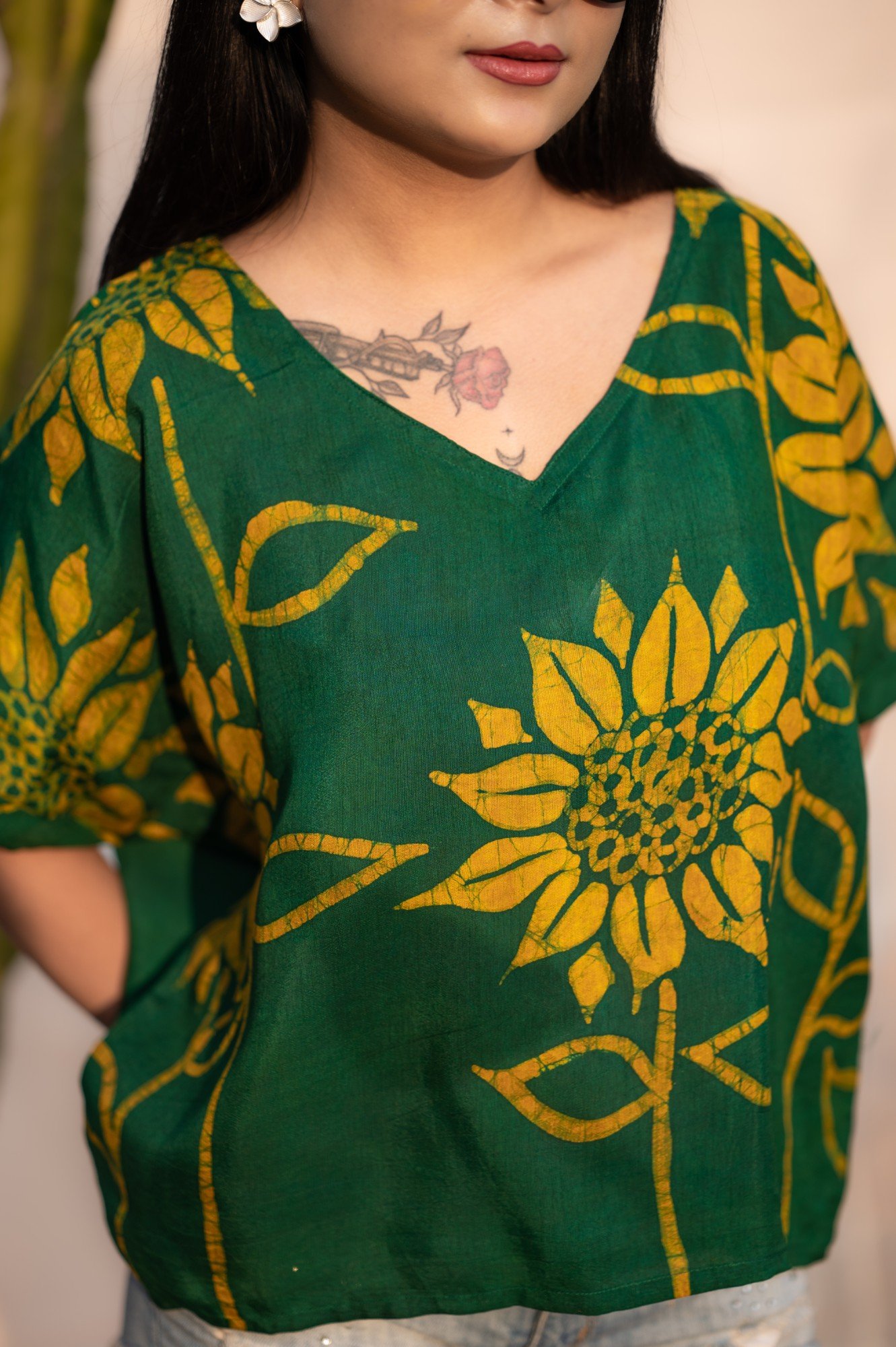 Sunflowers Hand-painted Batik Silk Cotton Crop Top (Green)